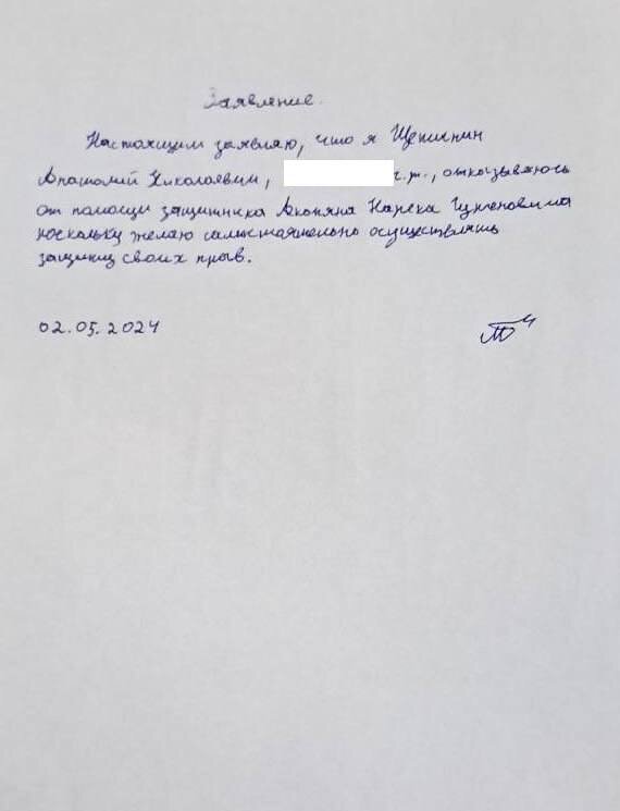 Изначально свое согласие на юрпомощь Щетинин письменно выразил 30 апреля, до того — 10 апреля — отказался от помощи. Второй отказ последовал 2 мая.