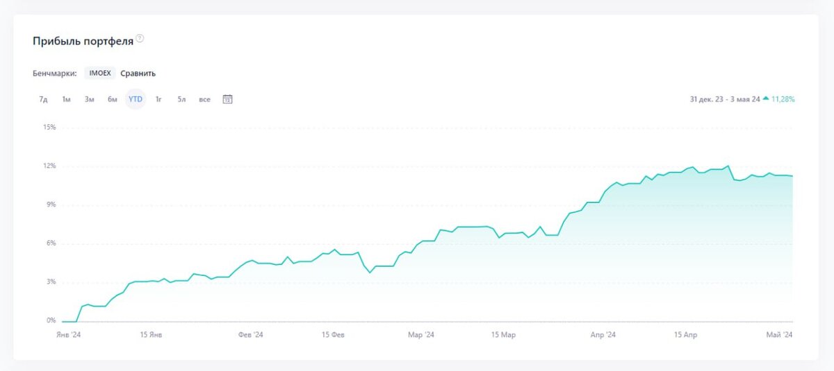 Нет ничего приятнее чем считать чужие гроши. Апрель выдался интересным, но не таким доходным как хотелось бы. Стоимость портфеля за апрель месяц выросла на 121 443 рубля, а вот прибыль портфеля за этот период составила 200 478 рублей или 1,92%. Дивидендов и купонов в апреле было не густо, если это негусто переводить на рубли, то сумма выйдет незначительная, а именно 52 459 рублей. Надеюсь, май будет более продуктивный, предварительно за май упадет 159 673 рублей. Доходность с начала года выглядит более интересно, кажется, только недавно мы открывали шампанское, встречались с друзьями и родственниками и фотографировались у елки, которую убрали только в начале марта, т.к. отмечать 8-е марта с елкой как-то не комильфо, а тут уже практически прошло полгода. С начала года портфель вырос на 11,28%, прибавив чуть больше миллиона рублей, при этом сумма дивидендов составила всего 257 тысяч, т.е. основной рост – это рост стоимости активов, что, если честно не радует. Да когда активы рас