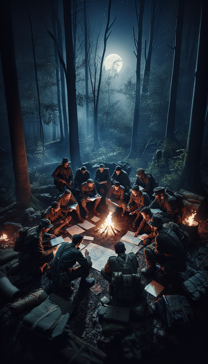 В глухом лесу, где лишь ветер знал пути, скрывалась группа партизан. Вечер опускался на землю, и вокруг костра собрались уставшие, но решительные лица.