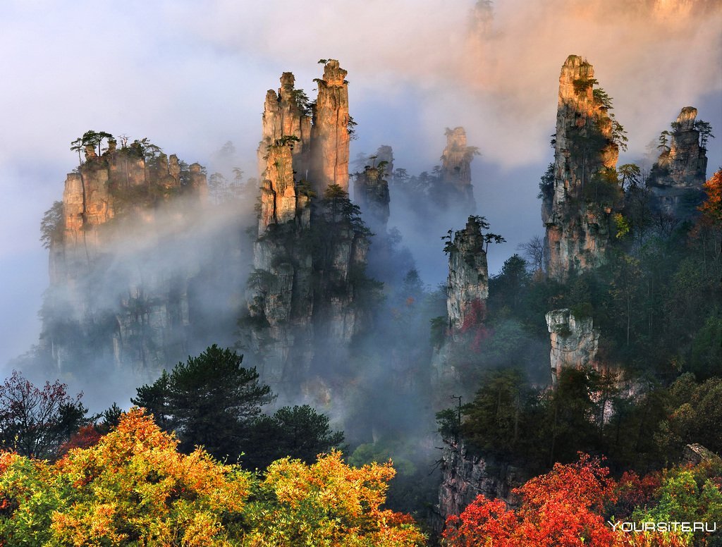 Горы Тяньцзы, Китай. Да, действие картины происходит на другой планете, но режиссёр Джеймс Кэмерон использовал в качестве натуры неземные пейзажи в китайской провинции Хунань. Особенно необычные виды открываются здесь во время лёгкого тумана. Основание гор, напоминающих столбы, скрыто, а верхушки будто парят над землёй. Такой эффект чаще всего можно наблюдать в сезон дождей: весной и в начале лета. Часто окруженные туманом, словно башни, вершины горы Тяньцзы резко поднимаются из покрытой деревьями земли внизу, создавая пейзаж, не похожий ни на один другой. Эти 21 км² горного ландшафта, расположенного в живописном районе Улиньюань на фоне Национального лесного парка Чжанцзяцзе в китайской провинции Хунань, действительно представляют собой одно из самых уникальных образований на Земле. Вполне уместно, что когда Джеймсу Кэмерону понадобилось вдохновение для инопланетного пейзажа “Пандоры”, изображенного в "Аватаре", он обратился к горам Тяньцзы. Ландшафт здесь меняется не только в ра