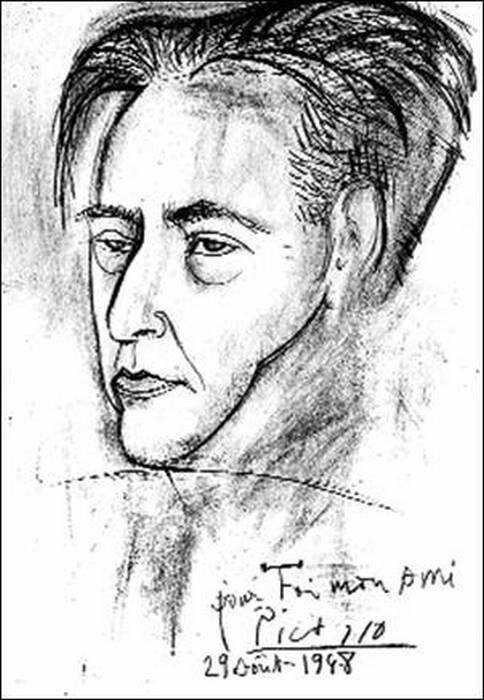 «В 1948 году после Вроцлавского конгресса мы были в Варшаве. Пикассо сделал мой портрет карандашом; я ему позировал в номере старой гостиницы "Бристоль". Когда Пабло кончил рисовать, я спросил: "уже?" — мне сеанс показался очень коротким. Пикассо рассмеялся: "Но я ведь тебя знаю сорок лет"... Портрет Пикассо мне кажется не только очень похожим на меня (лучше сказать — я похожу на рисунок), но и глубоко психологическим. Все портреты Пикассо раскрывают (порой разоблачают) внутренний мир модели. Очень давно, когда я сказал Пикассо о моей любви к импрессионистам, Пикассо заметил: "Они хотели изобразить мир таким, каким они его видели. Меня это не увлекает. Я хочу изобразить мир таким, каким я его мыслю"...»