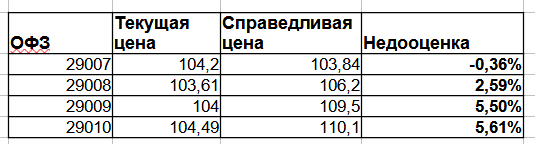 Чуть более месяца назад я приводил расчет недооценки старосхемных ОФЗ ПК по сравнению с аналогичными новосхемными: На тот момент недооценка получалась следующая: В приведенной модели были приняты допущения: Если первое допущение действует всегда. Это определение равнодоходности. То второе, а именно динамика ключевой ставки в будущем может быть различна. После последнего заседания совета директоров Банка России пошли разговоры о сдвиге начала снижения ключевой. Поэтому я решил пересчитать недооценку для различных вариантов движения ключевой ставки. Вариант 1 - это начало снижения ключевой ставки через полгода и динамика снижения на 0.5% раз в полгода. Для него я уже проводил расчет. Вариант 2 - начало снижения ключевой ставки через год и динамика снижения на 0.5% раз в полгода. Для этого варианта расчет справедливой цены старосхемных облигаций будет следующий: 29007: 29008: 29009: 29010: Вариант 3 - начало снижения ключевой ставки через год, динамика снижения на 1% раз в полгода до 2029