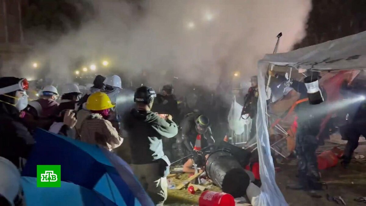 [ Смотреть видео на сайте НТВ ] Белый дом не станет запрещать протесты в американских университетах, но будет требовать, чтобы все проходило в рамках закона. Такое заявление сделал Джо Байден, комментируя волну студенческих акций в престижных вузах. Молодые люди протестуют по поводу действий Израиля в секторе Газа. И требуют от Вашингтона прекратить военную поддержку еврейского государства. Полиция ведет себя с участниками митингов и пикетов жестко. Число задержаний приближается к двум тысячам. Слезоточивый газ, резиновые пули — иначе как побоищем разгон лагеря пропалестинских протестующих в университете Лос-Анджелеса назвать сложно. Власти держались две с половиной недели, но даже в либеральной Калифорнии, кажется, уже устали от студенческих беспорядков. Полиция пошла на штурм после того, как на ультиматум покинуть территорию университета протестующие ответили возведением баррикад. Первую атаку копов удалось отбить, но силы были явно не равны. Студентка: «У нас нет перцовых баллончико