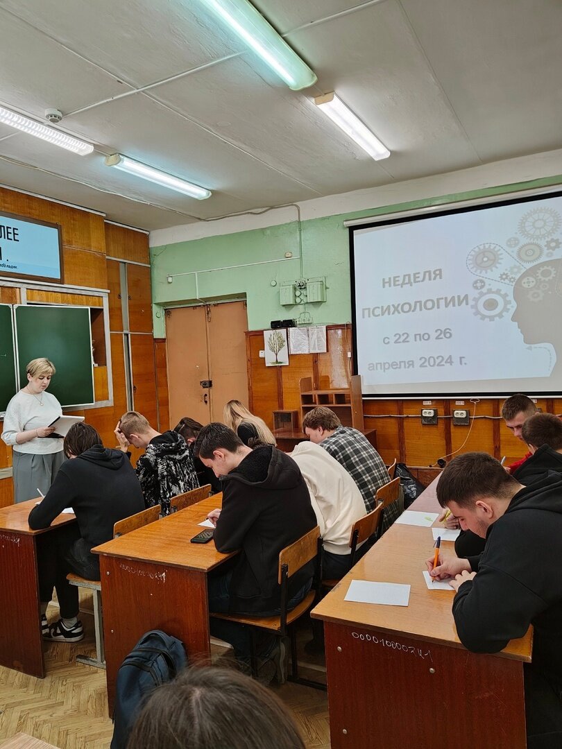 В рамках «Недели психологии» с 22 по 26 апреля 2024г. преподаватели психологии Солдатенкова В.В., Азаркина Л.Г. подготовили и провели ряд мероприятий в группах О-21-ПРО-2-СПО, О-21-ПРО-2-СПО, О-21-ПРО-3-СПО,О-21-ПРО-4-СПО. 22 апреля обучающиеся подготовили сообщения и презентации на темы: «Память», «Гиперопека», «Стресс», «Вербальные и невербальные средства общения», «Психология – как наука о душе». Целью данного мероприятия стало установление и поддержание благоприятного психологического климата у участников образовательных отношений. 23 апреля в группах 3 курса преподавателем психологии Солдатенковой В.В. было проведено психологическое тестирование на тему: «Определение уровня профессиональной ориентированности обучающихся». 24 апреля преподавателем психологии Азаркиной Л.Г. проведено тренинговое занятие на тему: «Развитие навыков жизнестойкости». На тренинге обучающиеся развили навыки жизнестойкости, актуализировали личностные ресурсы, сформировали позитивную социальную установку. П