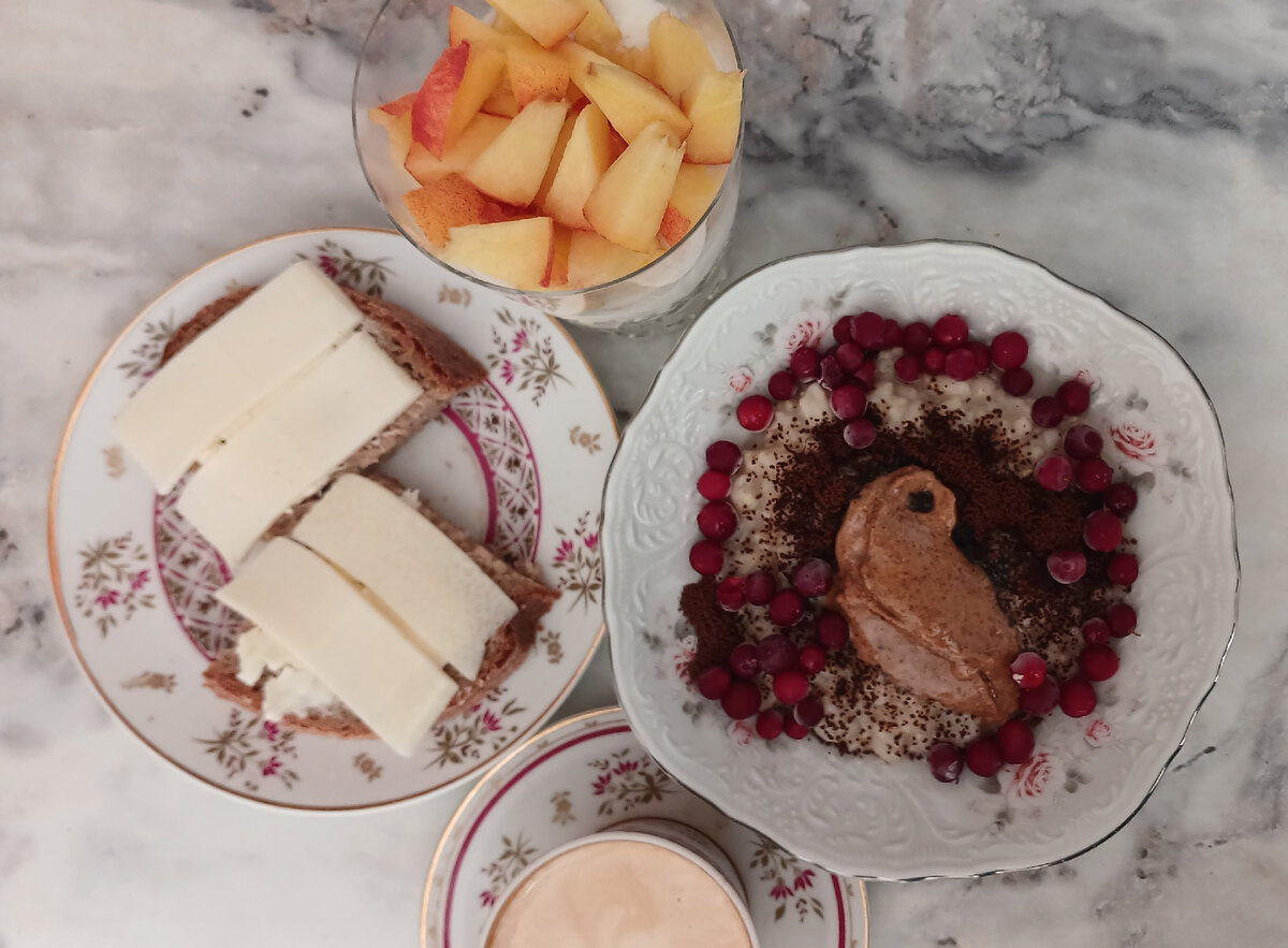 О моих запасах продуктов и бюджете на питание в мае можно почитать ЗДЕСЬ Каталог рецептов Покупка продуктов 1 - Мегамаркет, Вкусвилл, Магнит, Озон, Пятерочка Покупка продуктов 2 - Вкусвилл, Озон, Светофор, Дикси, Пятерочка Покупка продуктов 3 - Вкусвилл, Магнит, Пятерочка, Озон, Светофор, Дикси Покупка продуктов 4 - Вкусвилл, Дикси, Магнит, Пятерочка, Светофор Завтракаем сегодня так: овсяная каша с шоколадом, миндальной пастой и ягодами йогурт с персиками чашка кофе, бутерброды с сыром Миндальная паста на каше уложилась какой-то причудливой птичкой🤩 Сегодня сварила те щи, что не сварила вчера 😀 Бульон куриный, варила филе на оливье, часть мяса вернула в суп, часть порезала в салат К щам еще вареные яйца с майонезом, маринованная скумбрия, домашний хлеб После обеда - чашечка кофе на ужин котлеты из домашнего фарша (говядина +курица) и салат овощной. У моих еще булгур на гарнир. Котлеты делала с моцареллой. Внутрь котлеты положила кусочек сыра и залепила. Вкусно! Моцарелла тянется в г