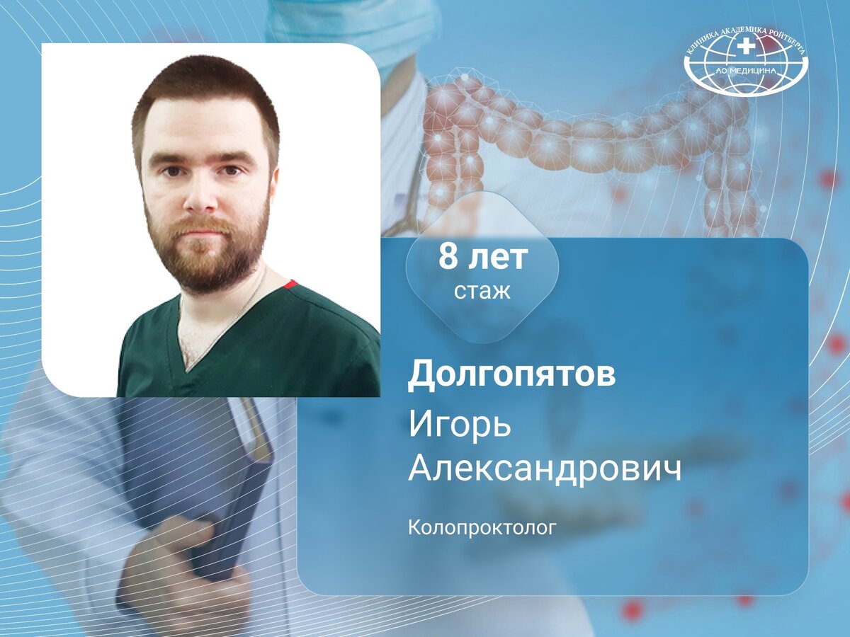 - В АО «Медицина» (клиника Ройтберга) прием ведет Долгопятов Игорь Александрович — врач-колопроктолог.