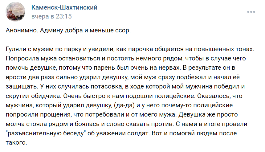В сети распространяется информация о том, что в Воронежской области ветеран СВО ударил девушку. Проходивший мимо прохожий заступился за нее. А после инцидента защитника жертвы заставили извиняться перед обидчиком полицейские. Эта история полностью выдумана. Идентичные посты были зафиксированы в пабликах других городов. К примеру, в Ростове и Белгороде. И в каждом таком посте утверждается, что случай произошел в местном парке. В каких-то моментах история перефразирована, но суть — одна и та же. И еще один важный момент. Аккаунт, который распространил эту информацию, зарегистрирован на украинский номер. Это типичная схема ЦИПсО, которая рассчитана на то, чтобы взволновать пользователей сети. В настоящее время фейковый аккаунт заблокирован. Было полезно? Подпишись на канал!