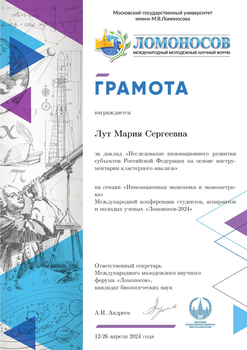 Магистр кафедры бизнес-информатики учетно-финансового факультета Лут Мария успешно представила Донецкий государственный университет на Международной конференции студентов, аспирантов и молодых ученых «Ломоносов-2024». Студентка приняла участие в секции «Инновационная экономика и эконометрика», получила грамоту за доклад «Исследование инновационного развития субъектов Российской Федерации на основе инструментария кластерного анализа». Поздравляем Марию и желаем ей новых ярких побед и профессиональных успехов!