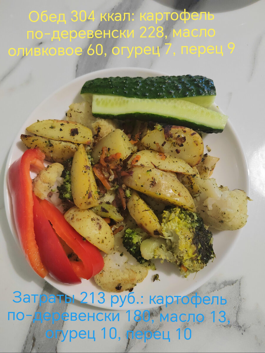 Сегодня на обед готовая овощная смесь Картофель по-деревенски 400 гр, оливковое масло половина столовой ложки, огурец 50 гр, перец 50 гр. На фото сверху калорийность, снизу стоимость блюда.