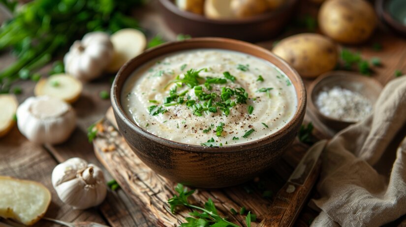 Соус для картошки по-деревенски - это классический соус, который часто подают к жареной или запеченной картошке. Этот соус имеет богатый вкус и аромат благодаря использованию натуральных ингредиентов. Он добавляет пикантность и насыщенность этому простому блюду, превращая его в утонченное угощение. Ингредиенты Пошаговый рецепт Советы по хранению Любые остатки соуса для картошки по-деревенски следует хранить в холодильнике в герметичной контейнере до 2-3 дней. Перед подачей его следует хорошо перемешать. Полезные свойства основного ингредиента Майонез и сметана являются источниками жиров, белков и витаминов. Лук и зелень обладают антиоксидантными свойствами и могут помочь в поддержании здоровья. Интересные факты о соусе