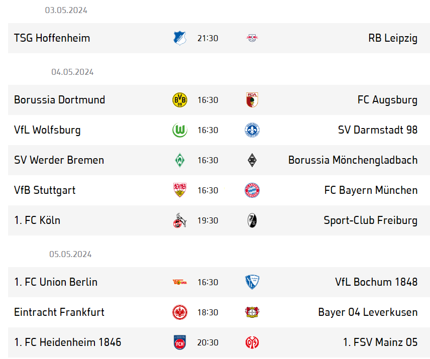 Бундеслига приближается к финишу, однако известен только чемпион и одна вылетевшая команда, всё остальное за три тура до конца ещё может измениться. В пятницу тур откроют «Хоффенхайм» и «РБ Лейпциг» - отличная вывеска. Насыщенные планы на субботу - один полуфиналист Лиги чемпионов в Дортмунде примет «Аугсбург», а другой («Бавария») отправится бороться за второе место в Штутгарт. Вечер субботы предлагается провести, наблюдая за попыткой «Кёльна» остаться в первой лиге. Воскресенье подарит нам выезд полуфиналиста Лиги Европы во Франкфурт, а так же ещё два матча, от результатов которых, напрямую зависит расположение команд внизу таблицы.