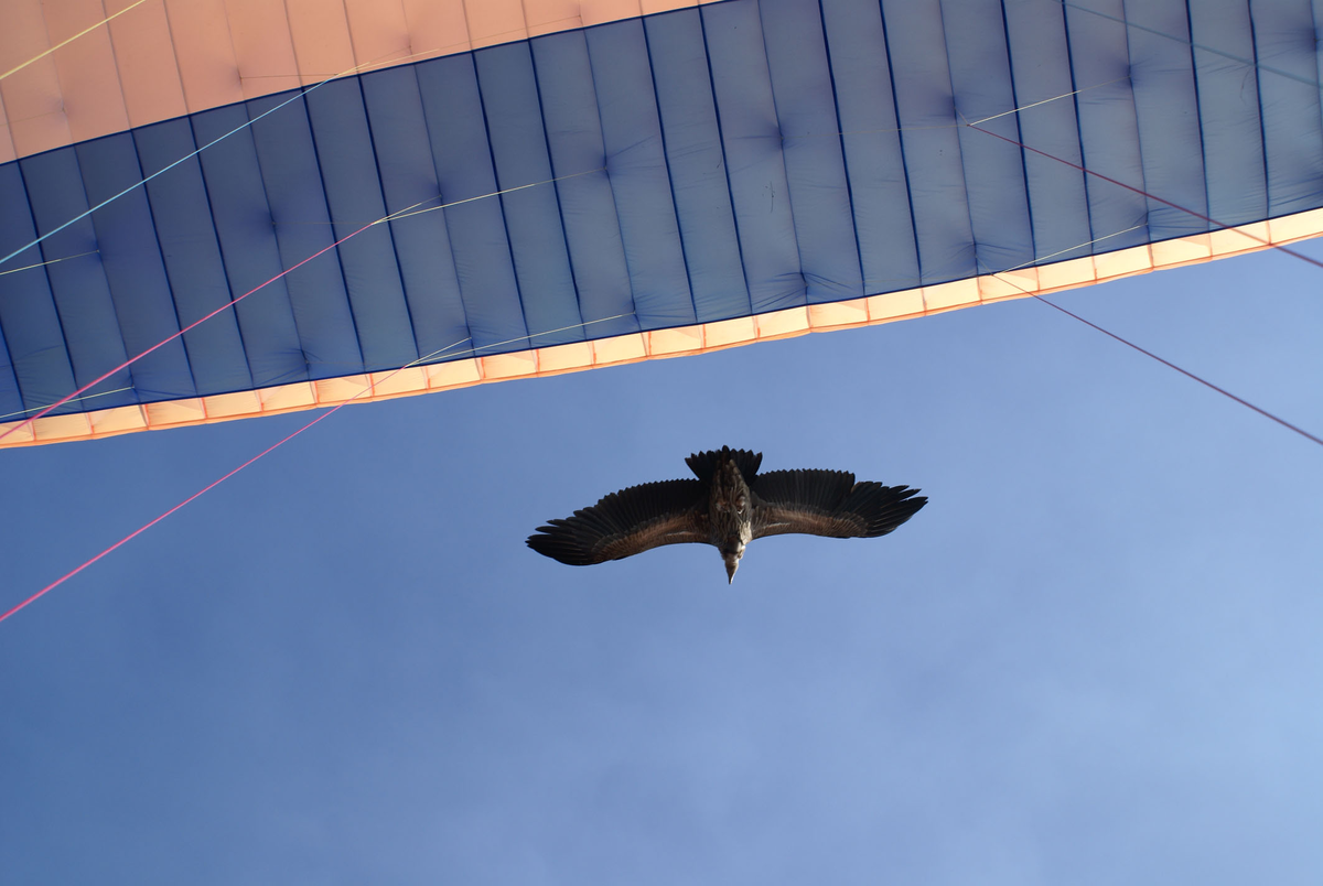 Но, как правило, уступают великодушно свой поток, и мы этим часто пользуемся. Этот же, с фотографии, повёл себя интересно. Он догнал моё крыло, сел на верхнюю кромку, не складывая крыльев, и стал одним когтем царапать ткань, проверяя, что это за хреновина такая, на которую он уселся? Всё это я наблюдал снизу, и на мои крики