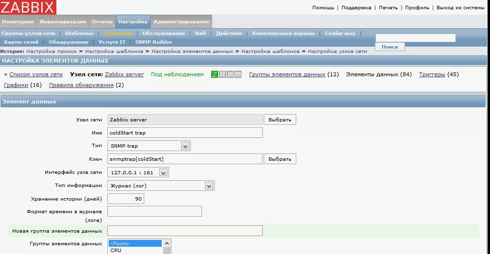 Заходим на Zabbiz login: root password: zabbix Смотрим список доступных локализаций системе CENTOS 8 # localectl list-locales Далее смотрим текущую установленную локализацию: # localectl System Locale: LANG=en_US.UTF-8 VC Keymap: us X11 Layout: us Добавим русский язык: # dnf install glibc-langpack-ru Соглашаемся с установкой пакета. Далее перезапускаем сервер # reboot Проверяем, что у нас получилось: # localectl System Locale: LANG=ru_RU.utf8 VC Keymap: ru X11 Layout: ru Далее снова переходим в профиль настройки ZABBIX уже в веб интерфейсе и наблюдаем при раскрытии настройки Language успешно установленную в систему локализацию русского языка (Russian (ru_RU)) Выбираем Russian (ru_RU) и нажимаем Update (для принятия изменений), изменения о смене языка интерфейса применяться сразу же, в результате интерфейс управления ZABBIX изменится на русский язык.