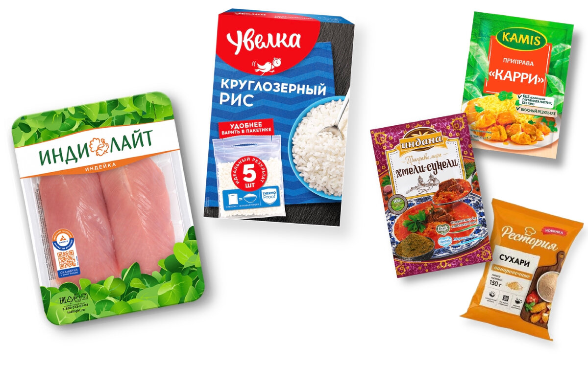 Филе индейки, рис, подсолнечное масло, панировочные сухари, яйцо, мука, специи (карри, хмели-сунел, красная паприка,сушеный чеснок) 1. Режем куриное филе (или филе индейки) на небольшие кусочки и начинаем готовить маринад: столовая ложка подсолнечного масла, специи (карри, черный перец, хмели-сунели, красная паприка, сушеный чеснок) и отправляем постоять на 3-4 часа. Кстати, карри я очень люблю и почти всегда добавляю к любому блюду с курицей, но недавно прочитала, что эта специя никакого отношения к индийской кухне не имеет. 🥴 По крайней мере, моей семье нравится и курочка получается сочная и пряная :) 2. Отвариваем рис с большим количеством специй (карри, хмели-сунели, смесь перцев). Я покупаю рис в пакетиках, получается не очень экономно, но удобно. 3. Спустя три часа достаем мясо отправляем в панировку (мука, яйцо,