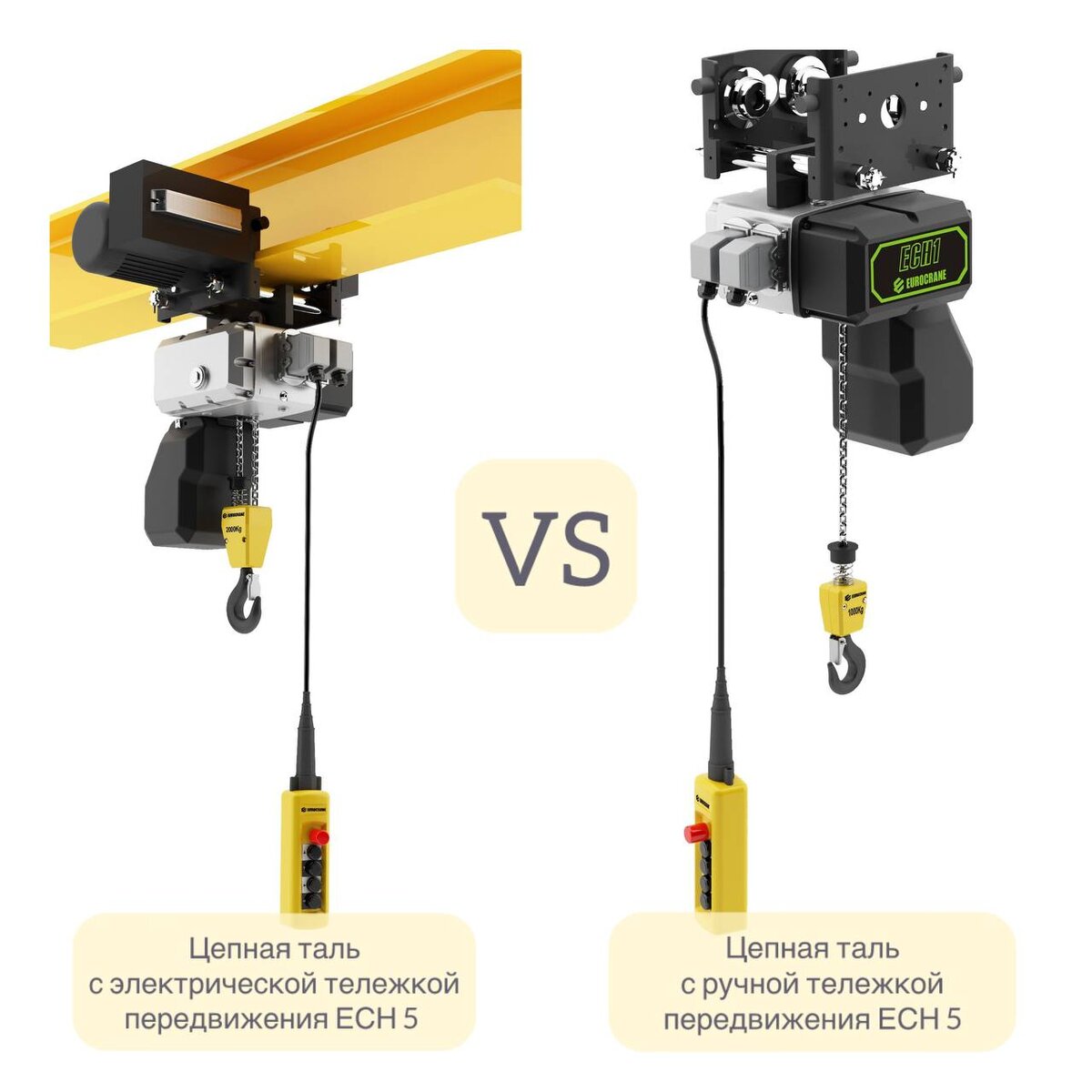 При выборе оборудования для подъема и перемещения грузов важно понимать их различия. Сегодня мы сравним два типа механизма передвижения цепной тали на примере ECH5: одну с электрической тележкой передвижения и другую с ручной тележкой передвижения. Обе тали имеют грузоподъемность до 5000 кг и обладают рядом общих характеристик. Краткие общие характеристики: Электрическая тележка передвижения: Ручная тележка передвижения: Выбор между этими моделями зависит от специфических потребностей производства: Выбор правильной тали поможет оптимизировать Вашу производственную логистику и повысить общую производительность.