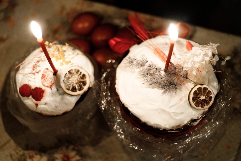 Бабушка всегда была хлебосольной и любила кормить людей. Она ставит кулич на стол, а я кладу рядом пару крашеных яичек.