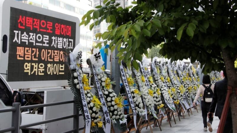 ARMY также отправили венки из цветов (такие же, которые отправляют на похороны как выражение соболезнований) к штаб-квартире HYBE. Такие венки часто используют протестующие, чтобы выразить несогласие с какой-либо организацией, объявляя о ее «смерти».