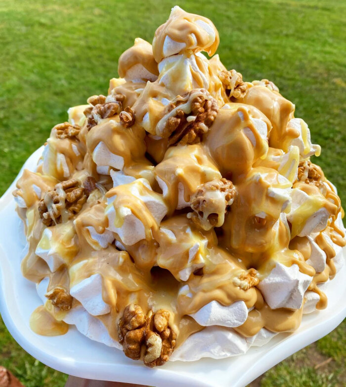 - Далее собираем торт из меренгов, смазывая их кремом.