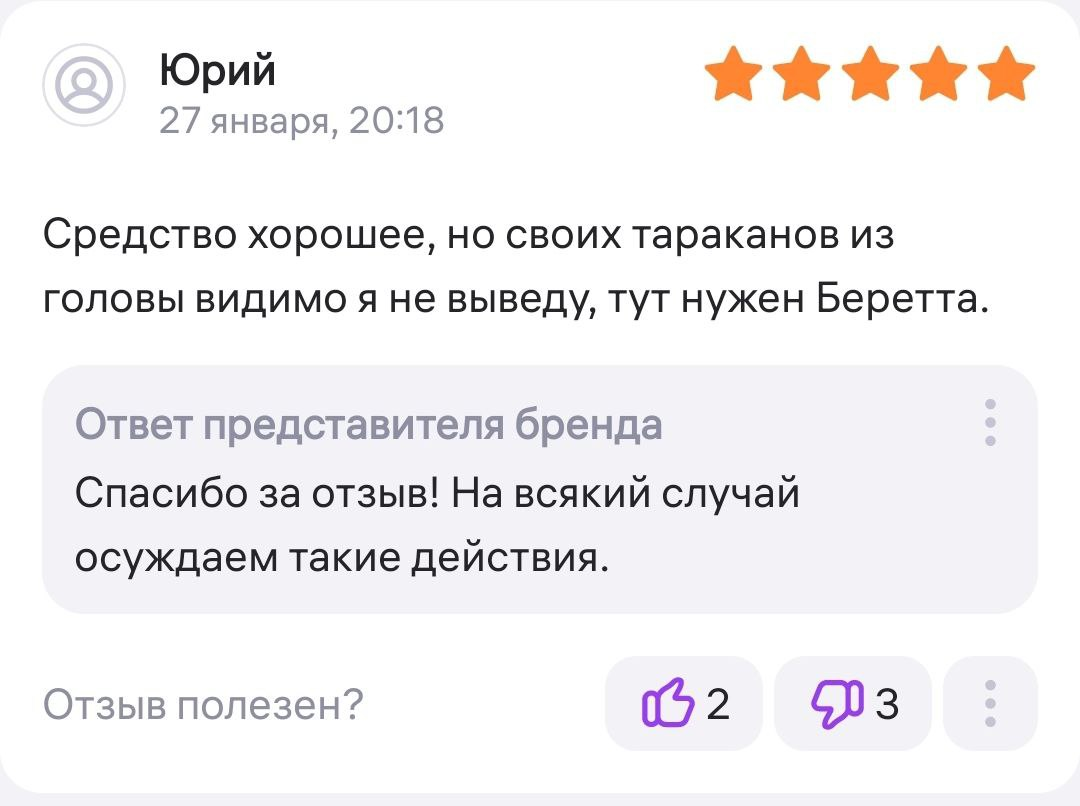 «Если хочешь стать миллионером, сделай всего одно действие...» — заинтриговал меня видеоролик. А в следующем кадре мужчина показал, что надо удалить с телефона известный маркетплейс. Спасибо, но нет. Пока на свадебных мероприятиях соревнуются, у чьей жены больше сумма выкупа, я изучаю Wildberries с другой стороны. Смотрю, что иногда пишут люди в отзывах к товарам, — иногда эти отзывы можно читать вместо анекдотов. Все представленные здесь экземпляры кропотливо собраны в скриншоты моими руками. Делюсь с вами личной коллекцией. 1. Это отзыв к средству от насекомых. Не знаю, что такое Беретта, но на всякий случай тоже осуждаю: 2. Я сюда что, поплакать зашла? Отзыв к женским чулкам: 3 Ещё никогда аргумент для покупки не выглядел столь убедительно: 4. Эффект мяты — это то, что я обычно вижу в зеркале по утрам? 5. А это не отзыв, а размерная сетка. Пожалуй, на свою кошку при подсчёте ориентироваться не буду, чтобы не впасть в депрессию. На самом деле это неверный перевод с китайского языка