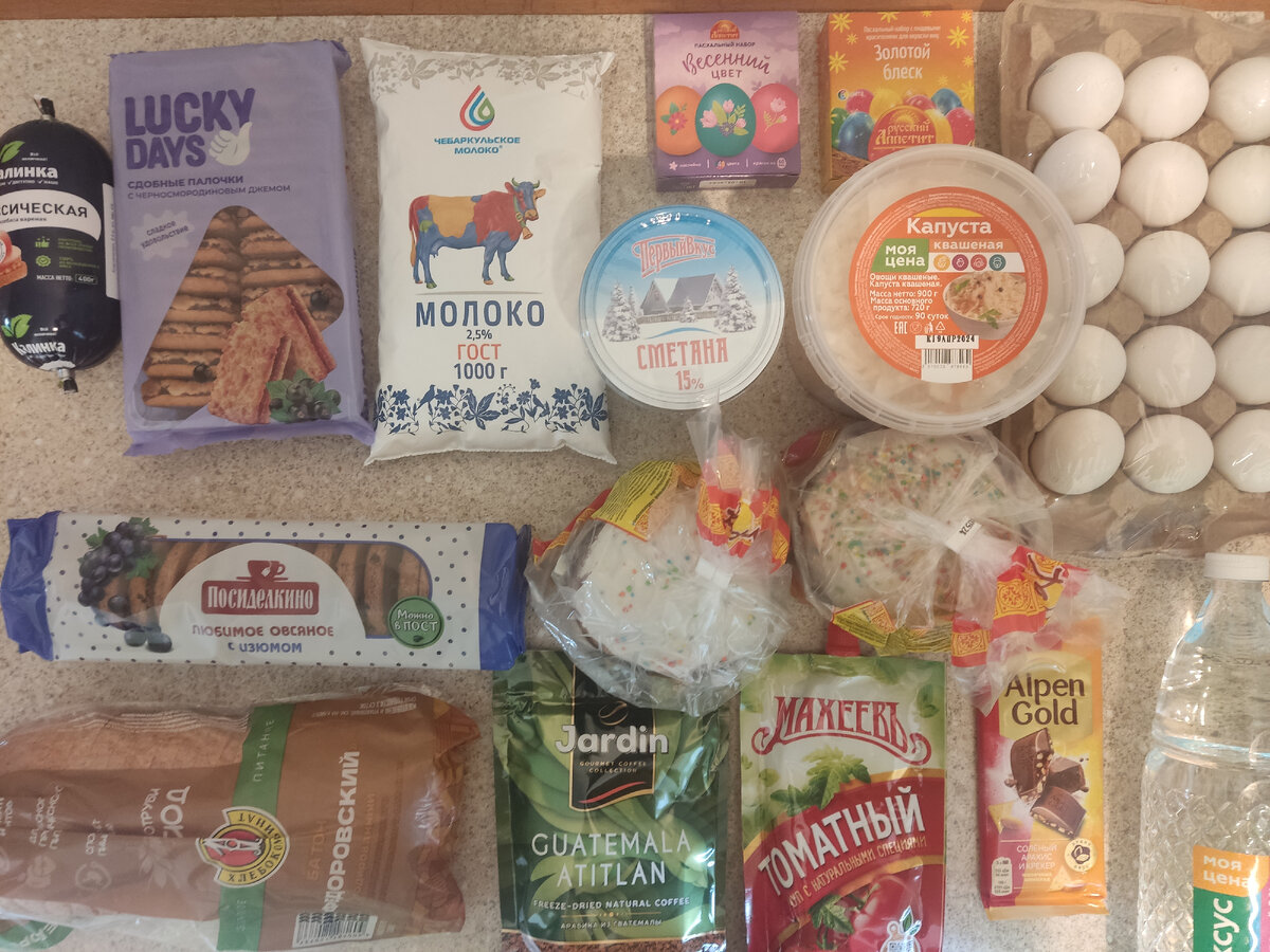 Наши сегодняшние покупки: куличи, яйца и пищевые красители, уксус, печенье разных видов, шоколадка, хлеб, колбаса, кетчуп, молоко и кофе...