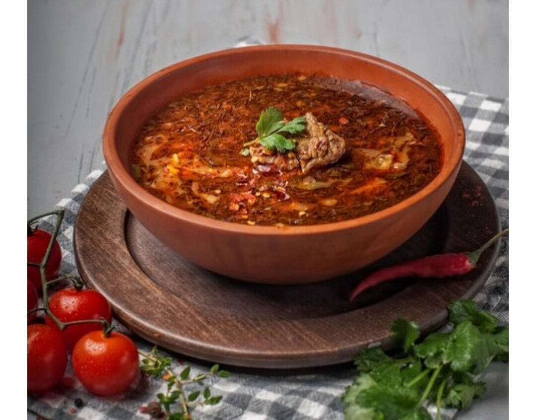 Харчо Ингредиенты : Приготовление : Харчо готовят преимущественно из говяжьей грудинки, но можно ее заменить и бараньей грудинкой. Мясо обмыть, нарезать небольшими кусками (из расчета 3-4 куска на порцию), положить в кастрюлю, залить холодной водой и поставить варить. Появляющуюся на поверхности пену снимать шумовкой. Через 1,5- 2 часа положить мелко нарезанный лук, толченый чеснок, рис, кислые сливы, соль, перец и варку продолжать еще в течение 30 минут. Томат слегка поджарить на масле и за 5-10 минут до окончания варки добавить в суп. При подаче на стол посыпать мелко нарезанной зеленью кинзы, петрушки или укропом. Приятного аппетита .