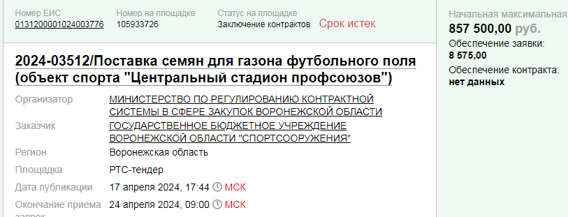 Качество газона на футбольном поле Центрального стадиона профсоюзов в Воронеже вскоре может стать лучше. Правительство области в лице его бюджетного учреждения – «Спортсооружения» - закупает 700 кг семян для газона футбольного поля на ЦСП, где проводит домашние игры ФК «Факел». В завершающем сезоне РПЛ нашей команде осталось провести три домашних матча – 6 мая с питерским «Зенитом», 12 мая – со свердловским «Уралом» и 25 мая с грозненским «Ахматом». После чего ЦСП на улице Студенческая, 17, который региональные власти в некоторых документах уже называют по-иному – «Центральный стадион ФК «Факел», - будет закрыт на несколько лет на реконструкцию. А футбольная команда будет проводить свои домашние игры на новом и одноименном стадионе «Факел», что на ул. Писателя Маршака. Так-то закупаемые семена для газона на ЦСП фактически предназначены для проведения трех домашних матчей воронежского «Факела». Покупка двух сортов семян общим весом 700 кг стоила недорого облбюджету, всего 857,5 тысяч ру