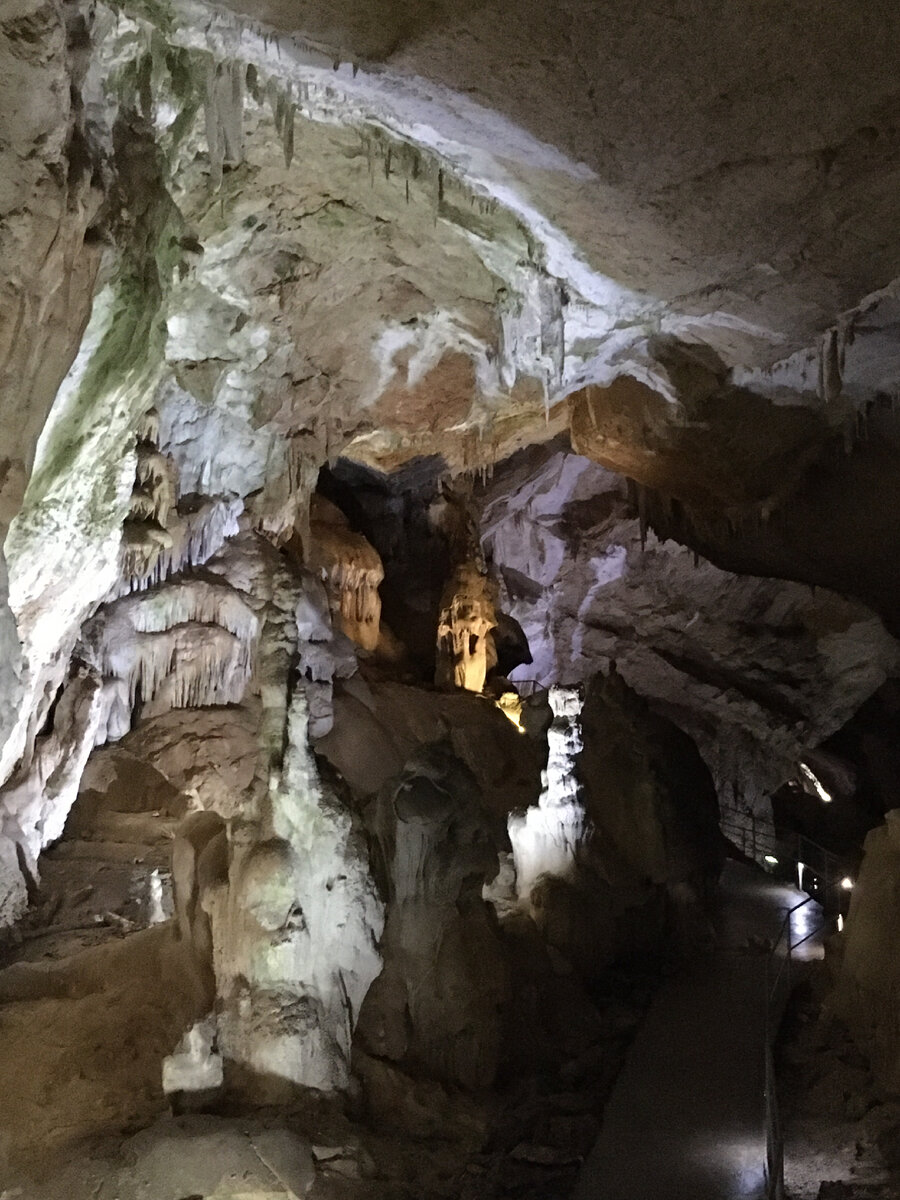 Это самое настоящее подземное царство в несколько этажей: галереи, залы, гроты, заросли «каменных сосулек» – сталактитов, сталагмитов и сталагнатов, причудливые натёки: статуи, изваянные водой и временем, вулканчики, каменные водопады, в которых будто застыли струи воды, «поцелуйчики». Это когда сталактит и сталагмит растут и тянутся друг к другу и соединяясь образуют сталагнат. Нам показали почти случившееся единение растущего сверху сталактита и сталагмита под ним. Этот поцелуйчик состоится через несколько тысячелетий ! Ведь растут сталактиты и сталагмиты очень очень медленно .