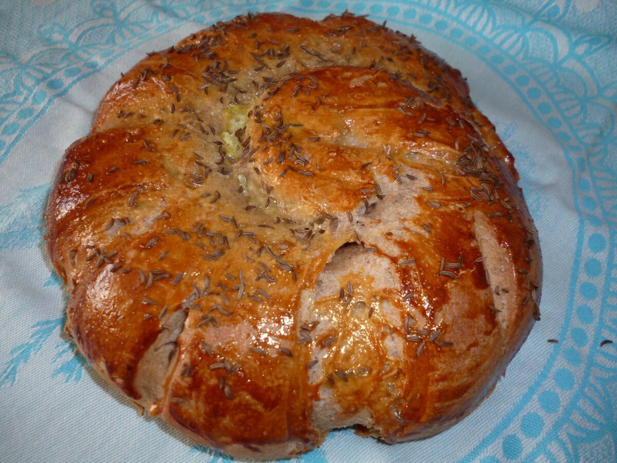 Ингредиенты: ржаная мука-150 г; пшеничная мука-210 г; вода-125 мл; рафинированное подсолнечное масло-2 столовые ложки;сухие дрожжи-1 чайная ложка;соль- 1 чайная ложка; сахар-1 столовая ложка; мед-1/2 чайной ложки; тмин-1 чайная ложка. Смешать дрожжи с сахаром и добавить теплую воду. После появления пенки на дрожжах, влить жидкий мед и растительное масло. В дрожжевую массу просеять сначала пшеничную, затем ржаную муку. Замешать тесто, если муки не хватит немного подсыпать смеси из ржаной и пшеничной муки. В самом конце замешивания, всыпать тмин и соль. Очень тщательно перемешать и сформировать шар. Накрыть тесто вафельным полотенцем и поместить в теплое место на 4 часа. Тесто должно увеличиться в 2 раза, раскатать его в прямоугольник, из него скатать жгут и завернуть жгут улиткой. Поместить булку на противень, застеленный пергаментом и смазанный растительным маслом, противень поместить в разогретую духовку до 50 градусов на 50 минут. Хлеб достать, верх смазать желтком, посыпать т