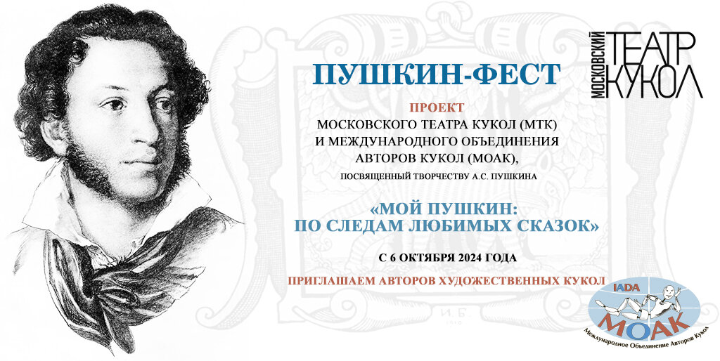 К октябрю 2024 года собираем новый проект "МОЙ ПУШКИН: ПО СЛЕДАМ ЛЮБИМЫХ СКАЗОК" Выставка посвящена фестивалю ПУШКИН-ФЕСТ, который состоится в МОСКОВСКОМ ТЕАТРЕ КУКОЛ - МТК. Для вдохновения и создания кукол можно использовать не только сказки великого поэта, но и поэмы, и стихи, и повести. УСЛОВИЯ УЧАСТИЯ В ПРОЕКТЕ: Каждый участник проекта получает Диплом участника от Московского театра кукол; Работу нужно привезти в Московский театр кукол до 1 октября 2024 года; Работы находятся в театре минимум 1 месяц; Оргвзнос 1000 руб.; Для членов Международного Объединения Авторов кукол - участие бесплатное; Публикации фото и видео каждой работы отдельно на всех наших ресурсах; Возможность продажи работы. Заявку на участие можно отправить на почту: iada2008@mail.ru Если ваша работа уже готова, присылайте ее фото, название, размер, цену. Узнать о вступлении в Международное Объединение Авторов кукол (МОАК) - iada2008@mail.ru www.dollslane.ru Директор МОАК Милена Курганова 8(916)037-16-24 ватсап, т