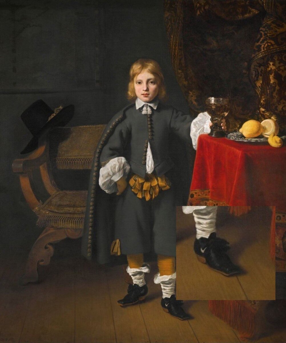 Это могла бы быть интеграция века, или лого Nike на картине Как говорят, все уже было придумано до нас. На работе художника Фернанда Боля, «Портрет мальчика», нашли знакомый логотип компании Nike, который появится только через 319 лет из-под руки графического дизайнера Кэролайн Дэвидсон. На Западе возникла волна обсуждений о том, как бренд мог оказаться на художественной картине. Некоторые предполагают, что это всего лишь отражение от пряжки на другой ноге, а другие считают, что Кэролайн, возможно, «вдохновилась» картиной при создании лого. Тем не менее, эта необычная находка вызвала интерес к пересечению истории и современности, став объектом увлекательного дискурса о времени и творчестве., #мода #логотип #тренд #Nike #реклама #Дзен #яндекс
