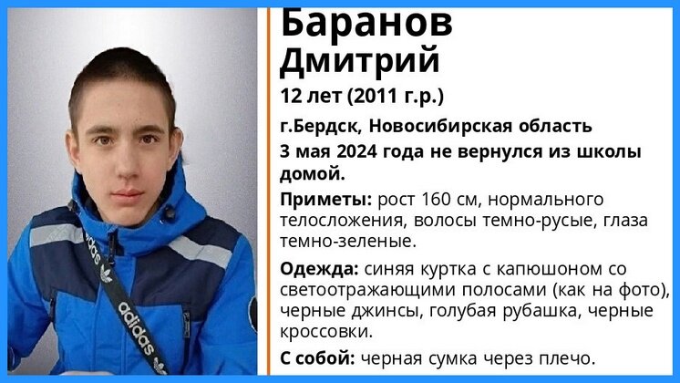 В Бердске без вести пропал 12-летний Дмитрий Баранов. 3 мая 2024 года не вернулся из школы домой. Теперь мальчика ищут волонтеры поисково-спасательного отряда (ПСО) «ЛизаАлерт» и сотрудники полиции. Приметы пропавшего ребенка: рост 160 сантиметров, нормальное телосложение, волосы темно-русые, глаза темно-зеленые. В день исчезновения был одет в синюю куртку с капюшоном, черные джинсы, голубую рубашку, черные кроссовки. При себе имел черную сумку через плечо. Если у вас есть информация о местонахождении Дмитрия Баранова, сообщите об этом по телефону ПСО 8-800-700-54-52 или наберите 112. Ранее «Вести Новосибирск» рассказывали, что поисковый отряд провел первые в новом сезоне весенне-полевые учения.