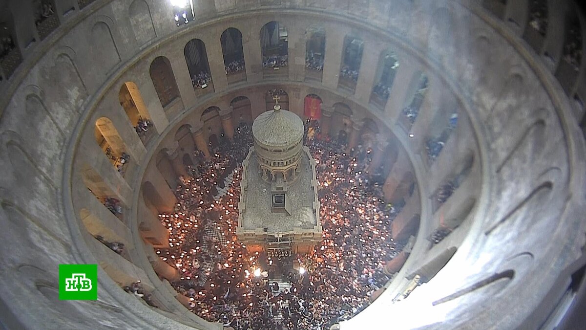 [ Смотреть видео на сайте НТВ ] В храме Гроба Господня в Иерусалиме произошло чудо схождения Благодатного огня. Телеканал НТВ вел прямую трансляцию церемонии. Благодатный огонь сошел в храме Гроба Господня в Великую субботу накануне православной Пасхи. Чудо произошло в Кувуклии — мраморной часовне, которая находится над пещерой, где было погребено тело Иисуса Христа. Собравшиеся в храме паломники под звон колоколов быстро передавали огонь друг другу. Люди держали в руках пучки из 33 свечей — по количеству земных лет жизни Христа. Храм наполнился светом и легкой дымкой. Порядок внутри храма обеспечивали десятки полицейских, дежурили медики и пожарные. В храме была слышна русская, греческая, румынская, арабская и армянская речь. Ежегодно в Иерусалим съезжаются тысячи паломников со всего мира. И этот год, несмотря на ситуацию в регионе, не стал исключением. Хотя верующих всё же было меньше, чем годом ранее. В районе Старого города уже сутки усилены меры безопасности, запрещен въезд трансп