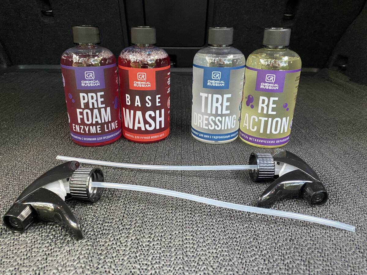 Продолжаю испытывать химию отечественного производителя Chemical Russian. Первое знакомство с данным брендом состоялось в начале лета, когда их средствами отмыл подкапотное пространство. Сегодня речь пойдет о средствах для мойки авто (первая и втора фаза) и средствах для ухода за колёсами. Все составы были приобретены на Wildberries. Итак, для кузова были куплены: Для колёс: До этого машина две недели не мылась и проехала примерно 600км. с последней мойки, вот как было ДО Начинаю с первой фазы, развожу 1/10 в теплой воде Далее смываю под давлением с помощью АВД и в конце, обязательно, проливаю без давления все стыки деталей, вымывая мелкие песчинки перед ручной мойкой. Следом вторая фаза, так же 1/10 в теплой воде. Далее очередь колёс: Следом наношу средство для улавливания металлических вкраплений Видно, что окрасилось в малиновый цвет не сильно, делаем вывод, средства, примененные ранее, хорошо отмыли колеса. После сушу шины и диски турбосушкой и наношу чернитель