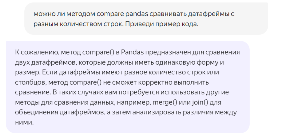 После релиза ChatGPT сверхпопулярным направлением стало создание промтов. Появилось много "экспертов", каждый из которых пытается предложить рецепт подходящего запроса. Пройдусь по одному из трендов - это расхожие фразы, которые призваны устранить логические и фактологические ошибки в ответах. Спросим у 4 нейросетей ChatGPT, GigaChat, Алиса Про,Gemini одно и то же, а потом попробуем скорректировать ошибки. Запрос такой: можно ли методом compare в pandas сравнивать датафреймы с разным количеством строк. Приведи пример кода. Ответ Алиса Про: Правильный. Кстати 10 минутами до, спрашивал то же и нейросеть отвечала постоянно неправильно, приводя неработающие куски кода (может мои многократные повторы одного вопроса расценились, как неудовлетворительный результат). Ответ GigaChat: Опять ответ верный и противоположный прежнему. Однако я вспомнил, что до этого задавал тот же запрос без "в" между словами compare и pandas. Вот, какой ответ в этом случае: Уже ответ неверный, однако GigaChat дает