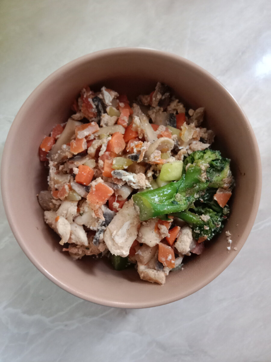 Всем привет, время показать вам, как я обещаю почти каждый день. Рецепт простой, подойдёт худеющим и тем, кто на ПП. Ингредиенты для основного блюда: -филе куриное - 100 г -брокколи (пара соцветий маленьких) - 50-60 г -морковь - 50г -тыква - 50г -грибы шампиньоны - 50-60г (около 2-х штук) -яйцо - 1 шт -кабачок - 50г -соль и перец по вкусу Приготовление: Филе нарезать на кубики примерно 2 на 2, выложить на разогретую сковороду без масла. Подождать, когда побелеет и, когда выпариться вода, добавить грибы. Чтобы не пригорело, можно налить пару столовых ложек воды. Когда грибы будут почти готовы, добавить все овощи разом и готовить ещё около 10 минут до выпаривания воды на среднем огне(может потребоваться немного больше времени). После выпаривания воды добавить яйцо и помешивать до готовности яйца. В самом конце добавить соль и перец. Готово! Это был рецепт основного блюда, к нему я ещё готовлю салат. Нарезаю один сливовидный помидор, один огурец, четверть болгарского перца. Добавить ст л