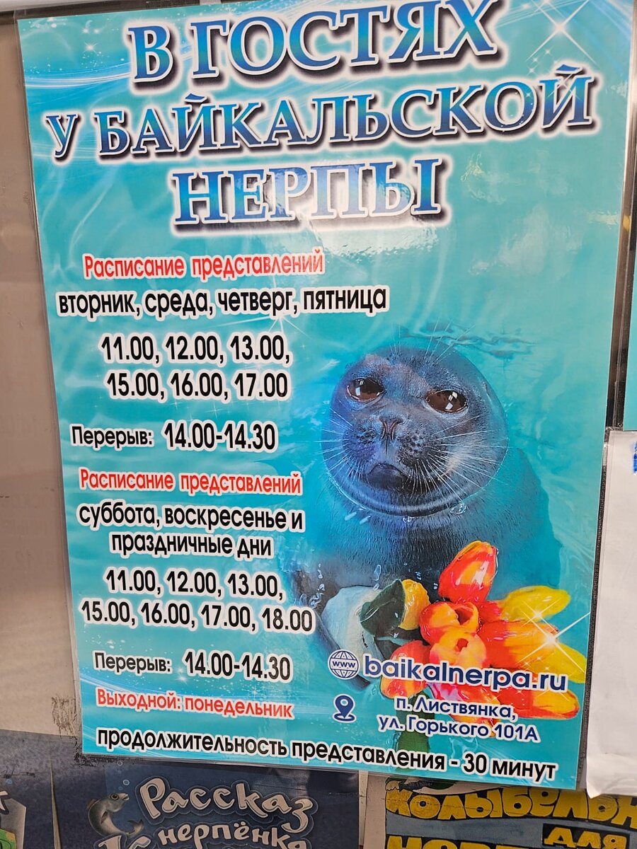 Мы решили посетить нерпинарий в последний день нашего проживания в Листвянке и заранее узнали расписание представлений на сайте организации.
