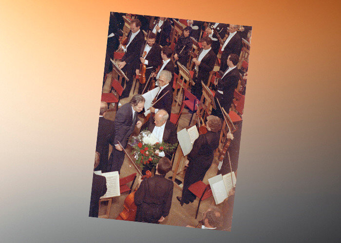 Многих выдающихся музыкантов связывала не только совместная работа, но и крепкая дружба. Именно такими были отношения Альфреда Шнитке и Мстислава Ростроповича. Редкая фотография из фондов Музея музыки запечатлела премьеру Шестой симфонии Шнитке. На сцене Большого зала Московской консерватории — Вашингтонский национальный симфонический оркестр во главе с дирижёром Мстиславом Ростроповичем. Автор симфонии благодарит его за исполнение. Музыкантов познакомил в 1987 году Юрий Башмет. Ростропович в этот момент жил за рубежом и был главным дирижёром оркестра в Вашингтоне. Однажды Башмет дал виолончелисту послушать запись Концерта Шнитке для альта с оркестром в собственном исполнении. Услышав музыку, Ростропович прослезился. Он захотел, чтобы Шнитке написал что-нибудь и для него, но не знал, как попросить об этом композитора, с которым не был знаком. Тогда Башмет предложил Ростроповичу передать Шнитке письмо с его просьбой. Вот что написал Ростропович: «Мне только что исполнилось шестьдесят, и