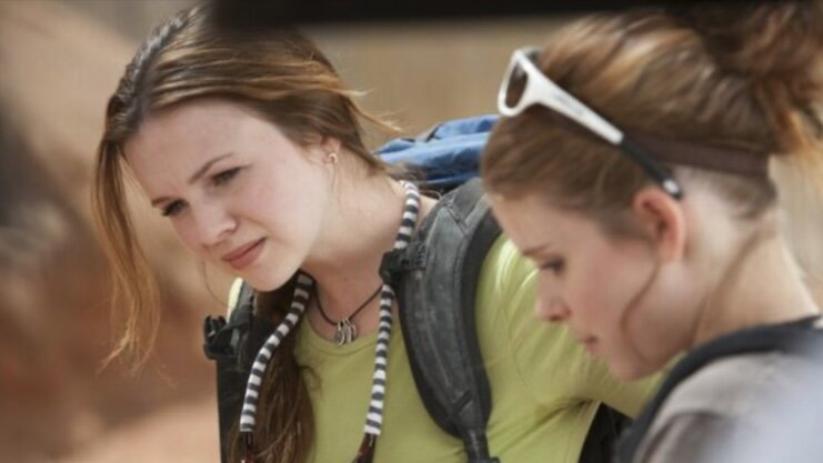 Арон доводит девушек до нужной развилки, которая указана в путеводителе. Но вместо того, чтоб идти по ней, он предлагает пойти по его маршруту, который будет гораздо круче. Девушки соглашаются. Троица перебирается по тесной глубокой расщелине, упираясь ногами в противоположный край расщелины.