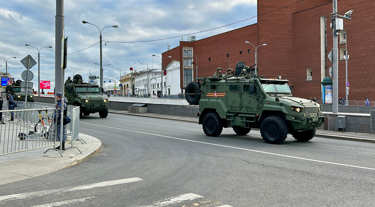 Похожие параллели позволяет провести и другая техника парада Победы-2024. По традиции подразделения разнотипных спецмашин механизированной колонны будут возглавлять знаменосные БТР-82АТ — актуальный вариант уже без преувеличения легендарного «бэтера» с 30-мм автоматической пушкой и заводским комплектом навесной защиты. Которую, увы, перед торжественным маршем почему-то демонтируют.