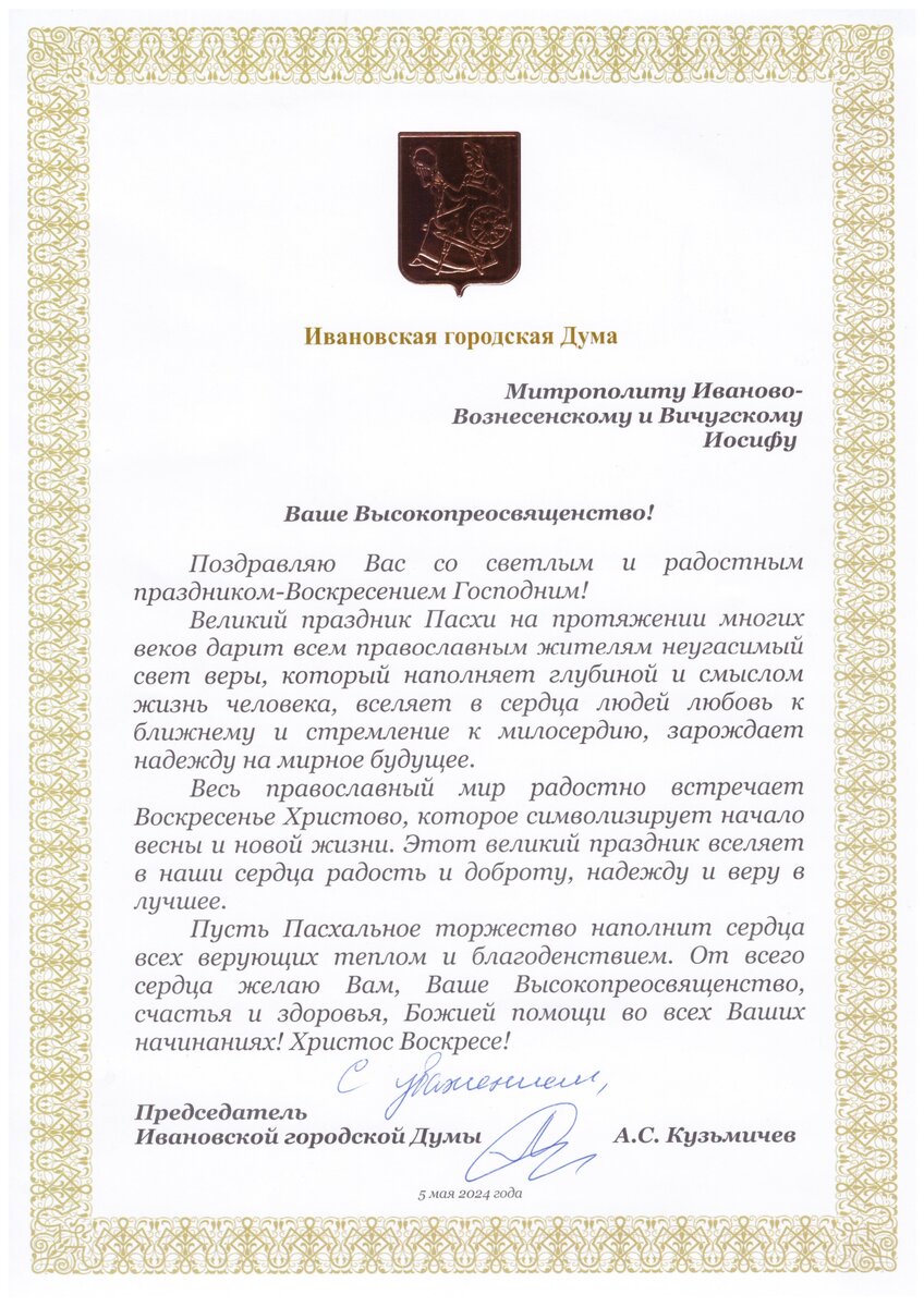 5 мая. Пасхальное поздравление председателя Ивановской городской Думы А.С. Кузьмичева