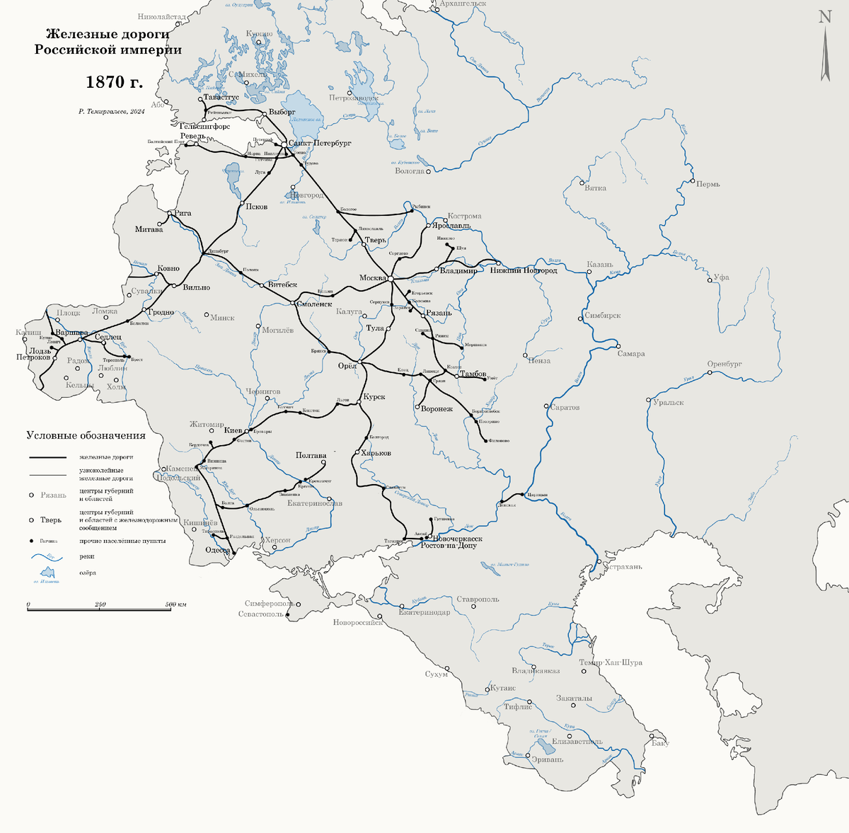 Напомню, что в фокусе нашего внимания – именно география. Поэтому технико-экономические особенности, различия между казенными и частными железными дорогами, источники привлеченных для строительства капиталов, названия обществ и компаний, ширина колеи (за исключением указания на узкоколейные железные дороги), а также количество путей в большинстве случаев остаются за скобками.