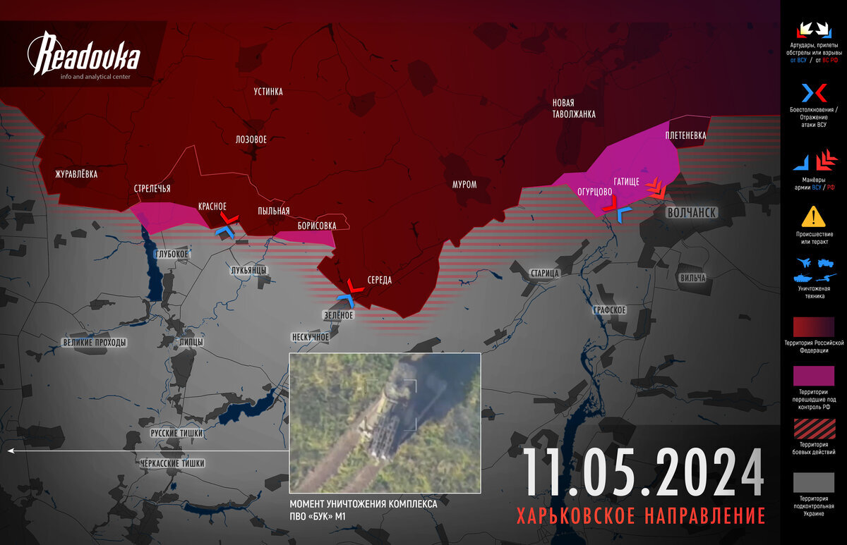 К 11 мая группировка «Север» выбила противника из Борисовки, Стрелечья, Плетеневки, Пыльного, Огурцово, ведутся бои в Красном, Гатище, Зеленом. Наступление наших штурмовых групп для создания «санитарной зоны» при поддержке артиллерии и авиации не только обеспечивает безопасность наших городов, которые подвергаются варварским атакам ВСУ, но и помогает достижению цели СВО – денацификации Украины. Осуществляются удары по мостам, батареям ПВО, ведется контрбатарейная борьба. Отдельно стоит выделить уничтожение РСЗО, которые каждую ночь наносят урон мирным объектам в приграничных областях. Согласно заявлениям МО РФ, сегодня дежурными средствами противовоздушной обороны в небе над Белгородской областью были перехвачены 21 реактивный снаряд и 9 БПЛА, 7 беспилотников были уничтожены над территориями Курской и Волгоградской областей.
