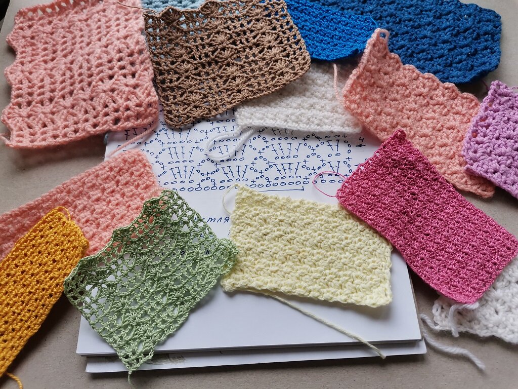 Подобрала в интернете несколько несложных схем и связала по ним образцы из ниток разной толщины и фактуры.
