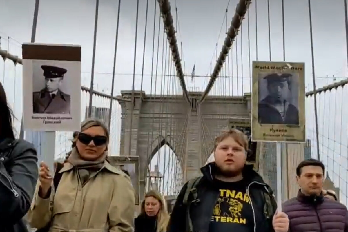 В акции принимают участие десятки россиян, выходцев из РФ и стран СНГ. Родственники солдат, которые погибли во Второй мировой войне, провели шествие по Бруклинскому мосту в Нью-Йорке, сообщает РИА Новости. Организатором акции является общество «Русская молодежь Америки». Пройдя через мост, демонстранты возложили цветы у Бруклинского военного мемориала в честь Дня Победы. В акции участвовали десятки россиян, выходцев из РФ и стран СНГ. В руках они несли цветы и портреты родных фронтовиков. Однако изображение георгиевской ленты на некоторых плакатах было заклеено. Глава «Русской молодежи Америки» Игорь Кочан пояснил, что это сделано из опасений за безопасность участников акции. По его словам, проукраинские активисты пытались обвинить участников шествия в демонстрации «политических символов» и лозунгов. Житель Нью-Йорка Михаил Куликов, который принимал участие в шествии, рассказал, что его дед Владимир Куликов воевал под Москвой, затем воевал на «Катюше» и дошел до Кенигсберга. По словам