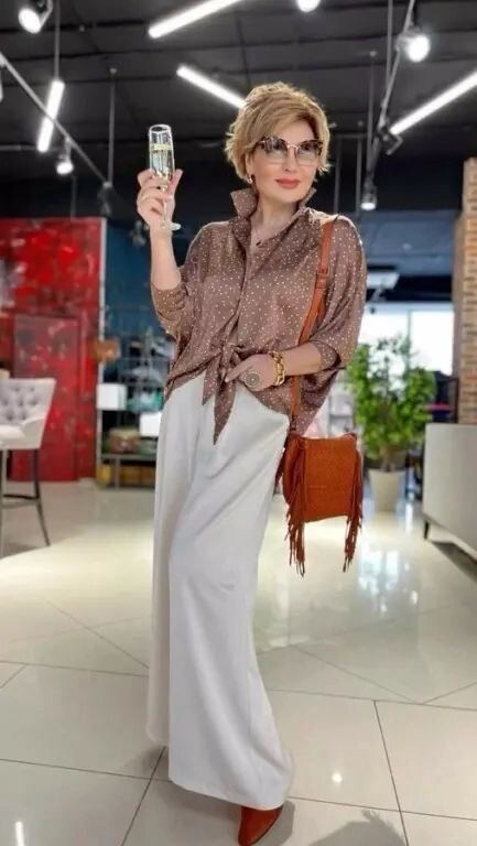 Как выглядеть сногсшибательно в предстоящий летний сезон? Простой и комфортный стиль кэжуал поможет в этом. Все решаемо благодаря насмотренности, примерам, практике, тогда образы станут интересными и разнообразными. Ниже подобраны разнообразные сочетания в стиле кэжуал. Большинство из них в светлых тонах, что освежает и омолаживает девушку элегантного возраста. Светлые брюки + блузка с принтом Сочетание, которое может выручить вас в любой момент – светлые брюки и блузка с принтом. Светлые вещи сами по себе смотрятся привлекательно, а если добавить к ним яркий акцент, то от этого дуэта будет не оторвать глаз. Самое важное подобрать удобные для себя брюки, а блузки можно менять в зависимости от погоды, мероприятия, настроения и т.д. Например, сочетание коричневой атласной блузки и белых брюк будет не только стильно смотреться, но и «дорого». Остается дополнить данный дуэт только аксессуарами и образ готов. Светлые брюки + однотонный верх В тандеме с однотонными светлыми брюками не хуже б