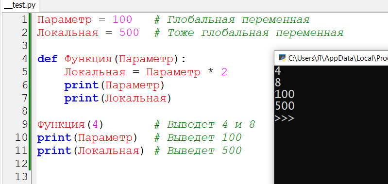 Я умудрился растянуть рассказ о функциях аж на четыре статьи (третья статья здесь). Несмотря на то, что это лишь самые общие сведения для новичков. Но именно потому, что всё это для новичков, я и не выдаю много сведений сразу. Сегодня с функциями закончим (во всяком случае пока). В Python, как и в большинстве других языков, параметры и переменные функций являются локальными. То есть видимы только внутри функции. При желании в функциях можно использовать глобальные переменные, но для этого придётся принять соответствующие меры (подробнее здесь). По умолчанию же все переменные внутри функции локальны. Пример: Здесь мы объявили две глобальные переменные. А затем одну из них использовали в качестве параметра в функции, а вторую - в качестве локальной переменной в функции (точнее, не сами переменные, а их имена). В нормальных языках программирования переменная с именем Локальная внутри функции являлась бы глобальной, потому что она не объявлена внутри функции. Но в Python нет каких-либо клю