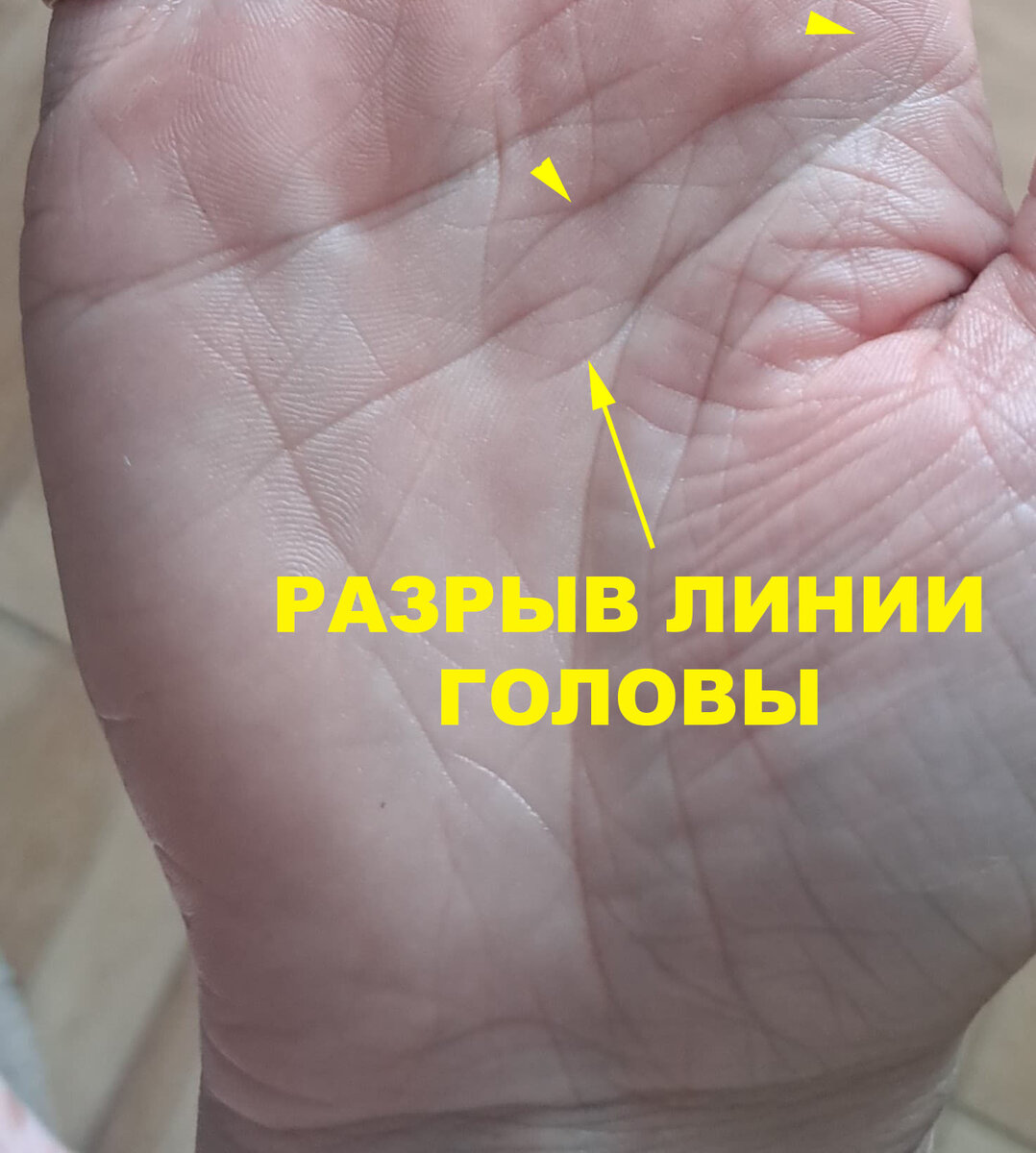 У некоторых людей Линия Головы имеет разрыв. Это существенный дефект линии, который несет негативную смысловую нагрузку и степень тяжести данного знака зависит от типа разрыва. Чтобы правильно интерпретировать разрыв, следует учитывать, что Линия Головы отвечает за головной и спинной мозг, соответственно, дефекты Линии могут относиться как к работе головного мозга, так и спинного, и могут указывать на проблемы и с головой или позвоночником.