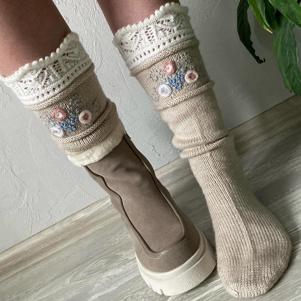 Мы уже знакомили вас с мастерицей, которая вяжет чудесные носочки. Статья "Носочки, достойные подиумов. Посмотрите, какую красоту создает Татьяна Вьюга". Судя по количеству просмотров, комментариев и лайков- тема эта понравилась, поэтому вот вам еще одна услада для глаз). Носочки от рукодельницы из Твери Анны. (Нюшкины Рюшки. Именно так названы аккаунты Анны в соц.сетях). Обязательно листайте галерею, там много красоты Такие носочки, конечно же, это уже не просто элемент гардероба, это настоящая находка для ценителей красоты, уюта и тепла. Каждая пара - маленькое произведение искусства, наполненное любовью и заботой и кропотливым трудом. Посмотрите, какие женственные носочки для дома. Согласны? Анна так описывает эту модель : «Такие ножки обязательно привлекут внимание, и заставят вашего мужчину оторваться от гаджетов. А вы будете чувствовать себя принцессой).» С этим описанием сложно поспорить, носочки и правда восхитительны!! Анна часто добавляет рюши, бантики, вяза