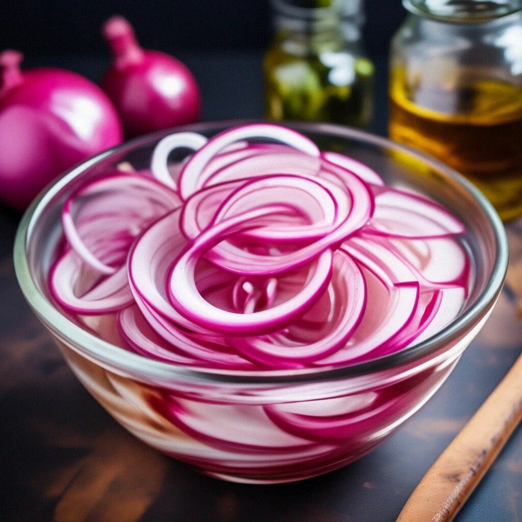 Ингредиенты: Репчатый лук - 350 гр. Уксус 9% - 4 ст.л Соль - 1 ст.л. (без горки) Сахар - 1 ст.л. (без горки) Укроп - 15 гр. Холодная вода - 250-300 мл. Приготовление: 1. Нарезаем репчатый лук полукольцами, а укроп порежем мелко, удалив жесткие стебли. 2. В миску наливаем холодную воду, добавляем соль, сахар, уксус и перемешиваем до растворения сахара и соли. 3. Добавляем лук и укроп, перемешиваем и оставляем на 20 минут. Маринованный лук почти готов к подаче (нужно лишь слить маринад.) Советы 1. Репчатый лук можно заменить на белый, красный, крымский или шалот. 2. Столовый уксус 9% можно заменить на яблочный, винный, рисовый, увеличив количество. 3. К укропу можно добавить мелко нарезанный зеленый лук, петрушку или заменить. 4. Укроп или другую свежую зелень можно заменить на сушеную, добавлять понемногу, т.к. вкус может оказаться чересчур насыщенным. #лук #к_мясу