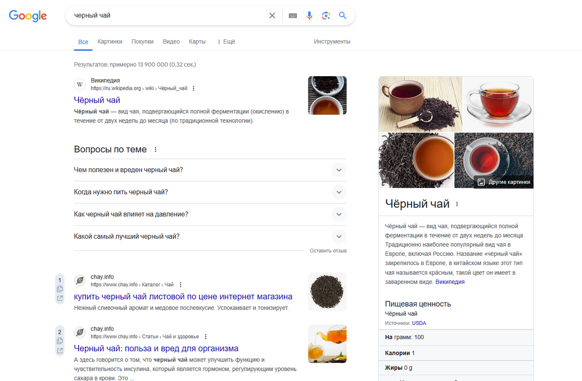 Например, вот как выглядит раздел PAA, если мы вводим “черный чай” в строку поиска: